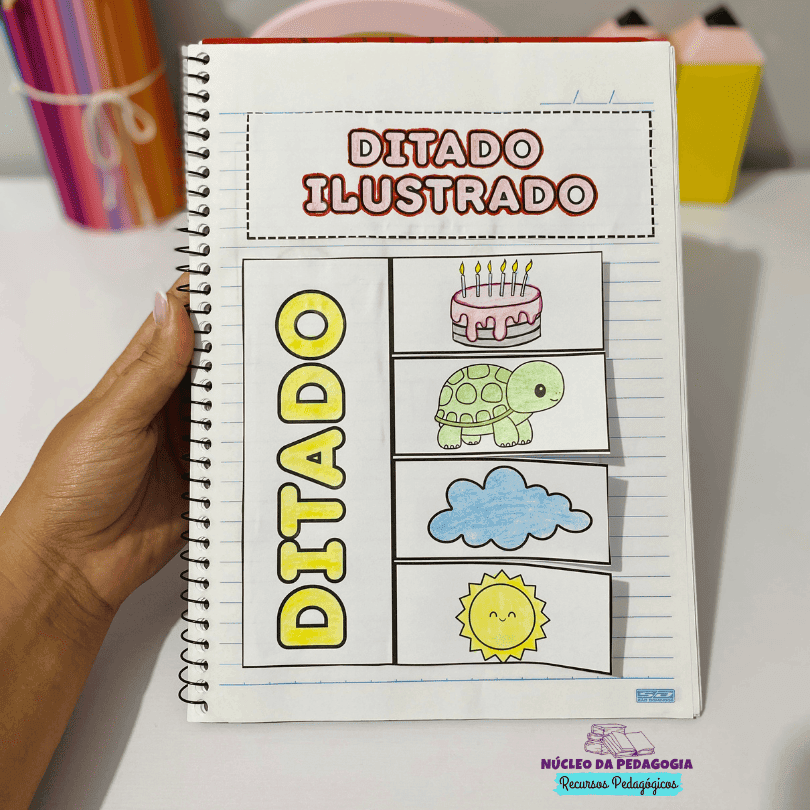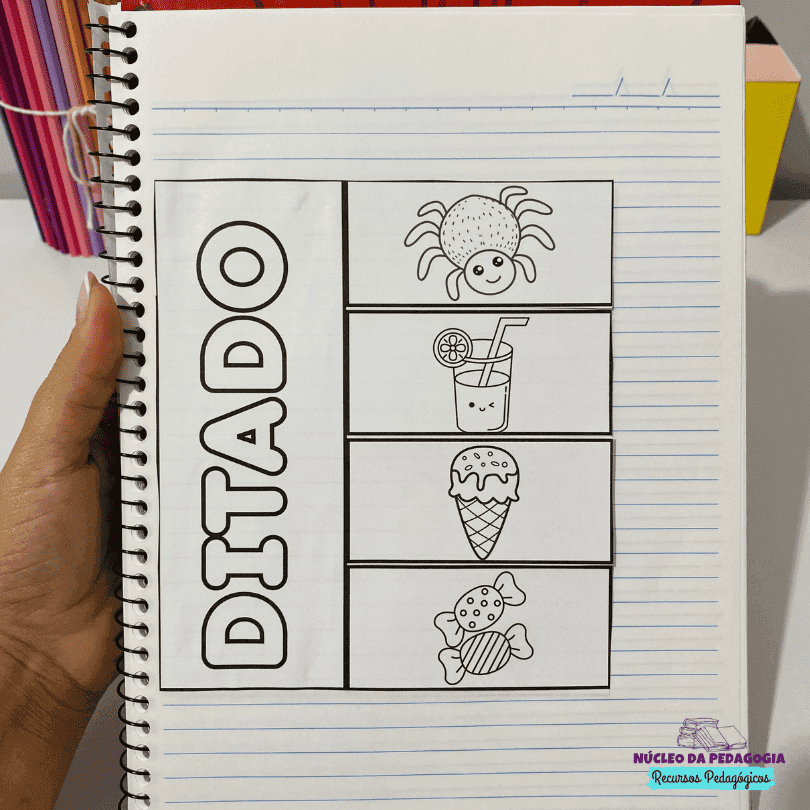 São 12 páginas com as ilustrações diferentes para realizar o ditado, podendo colar no caderno as folhas para os alunos escreverem as palavras de cada figura e colorir